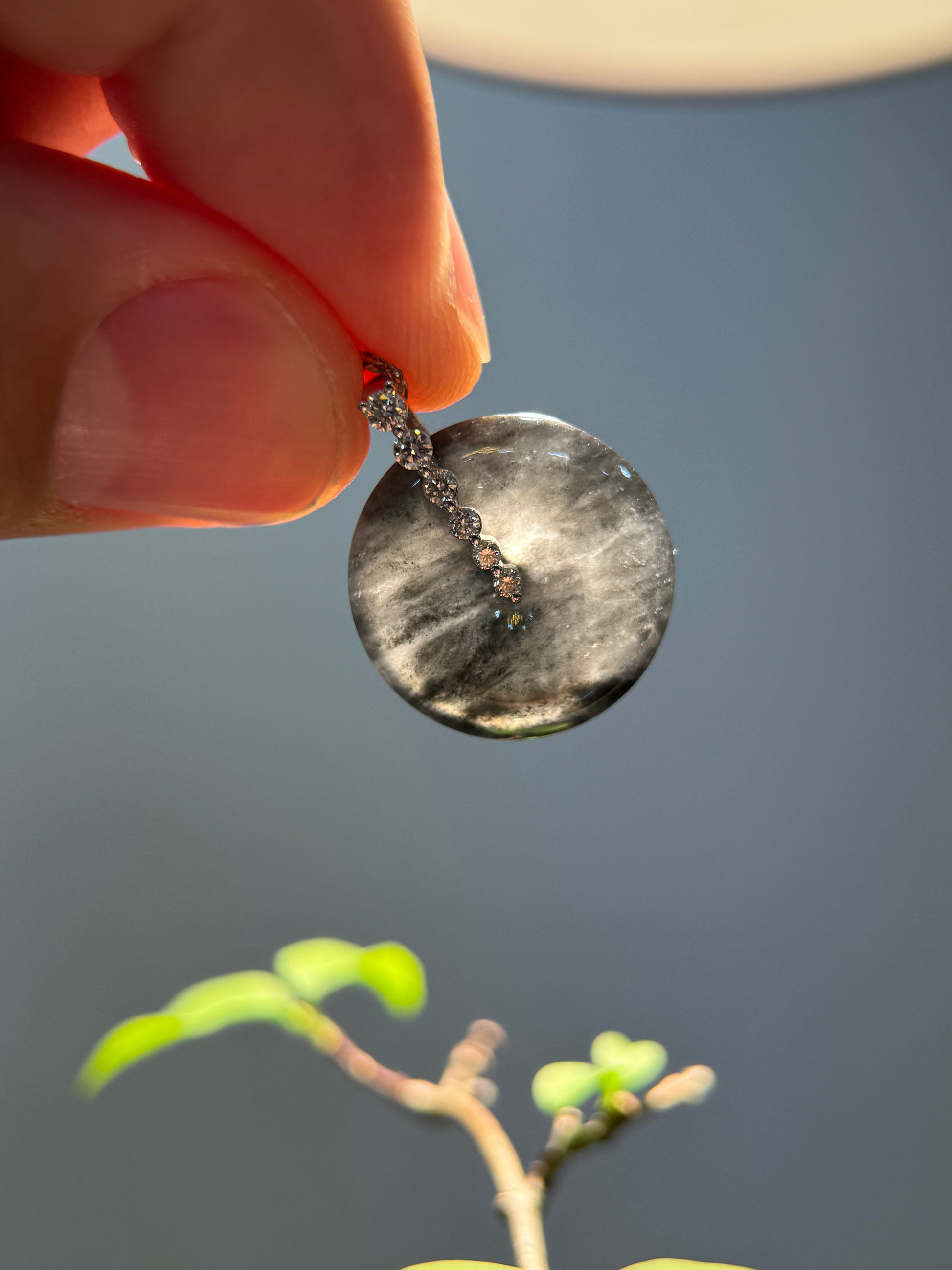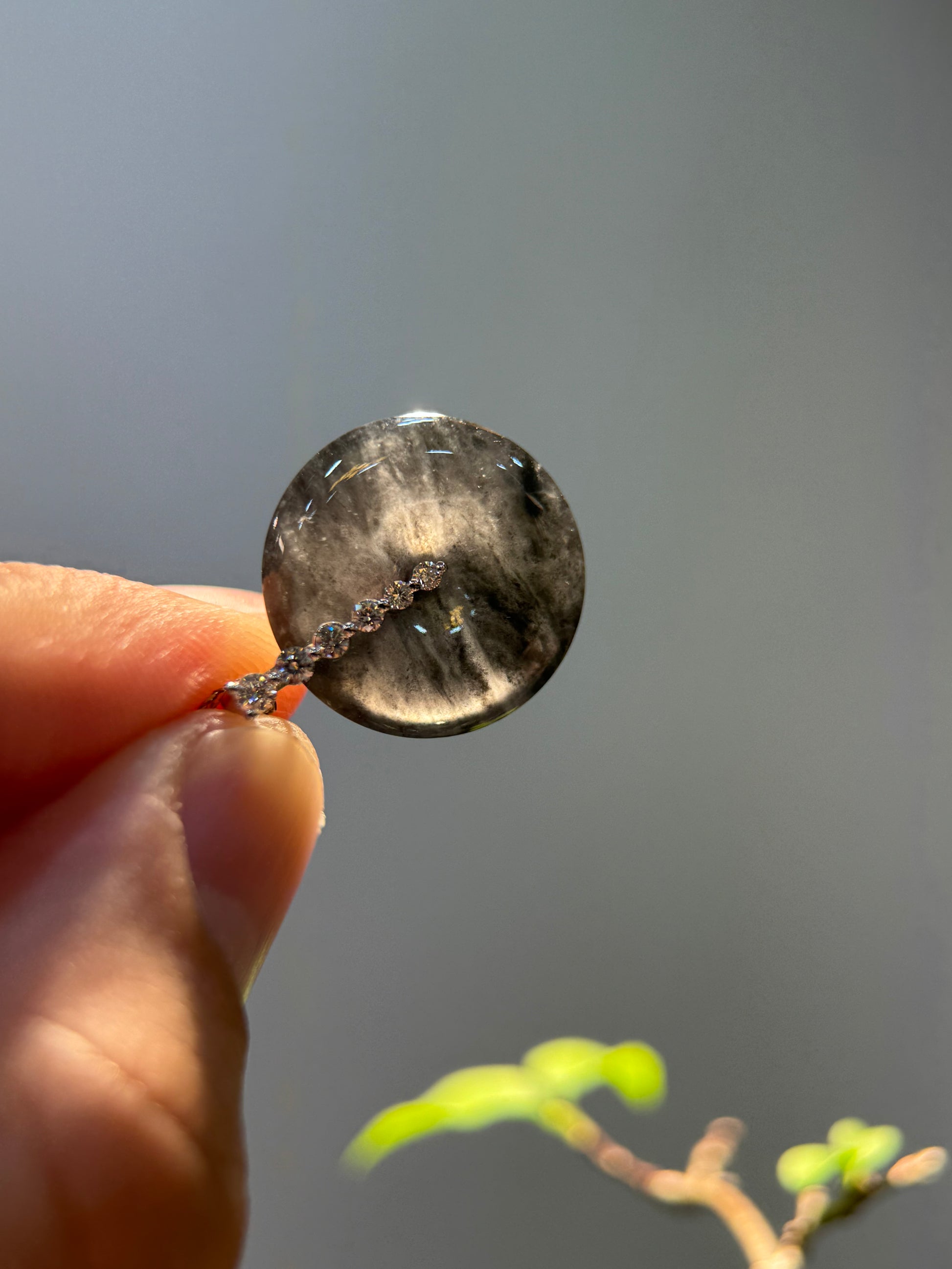 A rare yet elegant piece of black (乌鸡黑)safety coin jadeite pendant which has black tone spread across evenly just like a piece of chinese calligraphy art piece. The jade comes with good lustre, insignificant stone aggregate and highly translucent in quality. Set simply in 18K white gold with a line of brilliant cut diamonds, simple yet elegant.