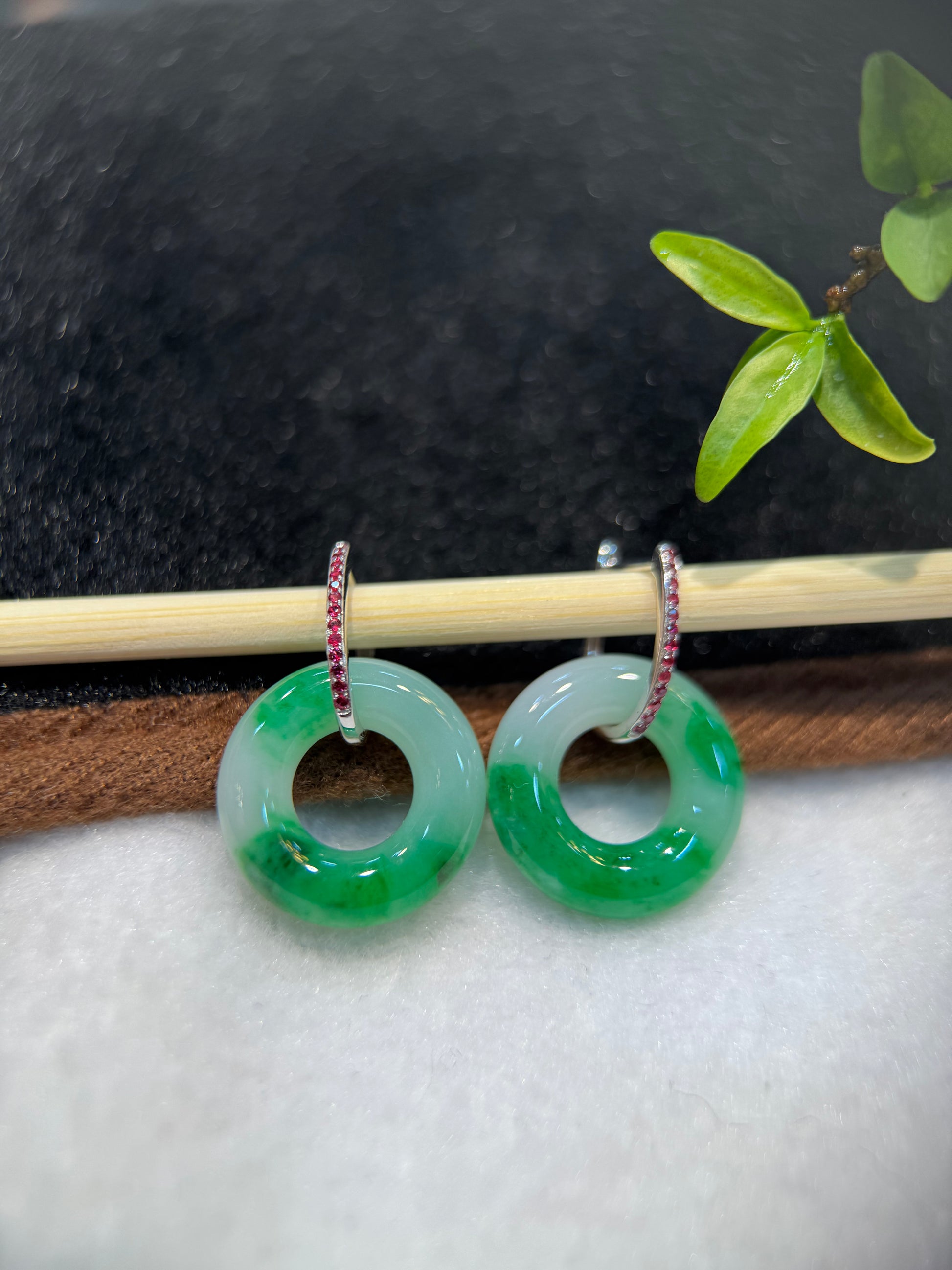 An elegant pair of green donut shape jadeite earring which has a patch of intense green falling across the jade and whitish clean on the other part. The jade comes with very fine density and good lustre quality. A fine piece of jewellery with insignificant inclusion. It comes with a pair of detachable white gold hook set in ruby which can also be used on any other pair of earring.