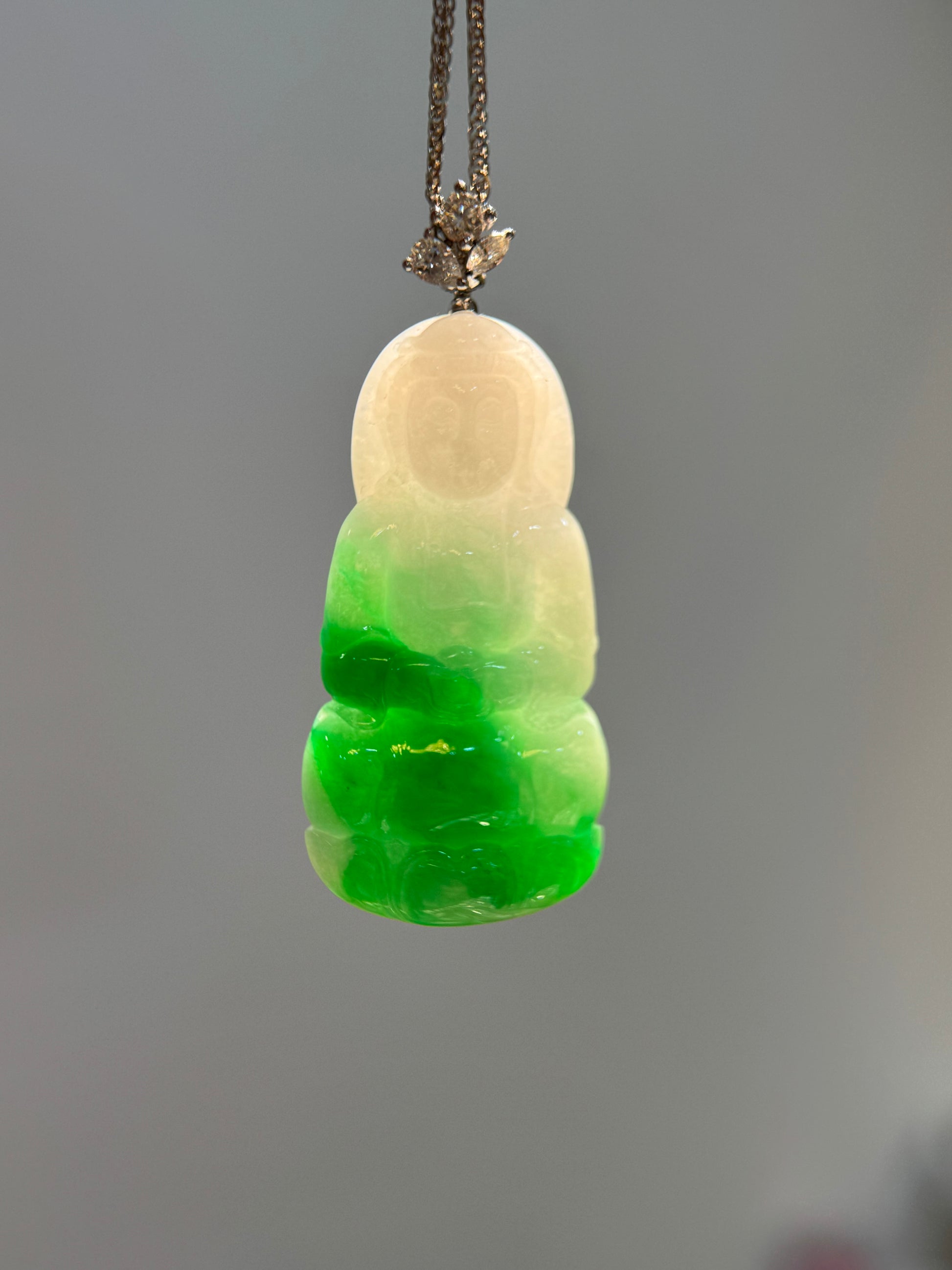 Rare and esteemed, a Goddess of Mercy design of this quality is a rarity in the market currently due to the scarcity of the high quality natural raw material. This pendant not only embodies exquisite artistry but also holds a unique appeal for collectors and connoisseurs of fine jade jewelry. Embrace the beauty and rarity of a timeless piece that transcends trends and celebrates the art of jade carving at its finest.