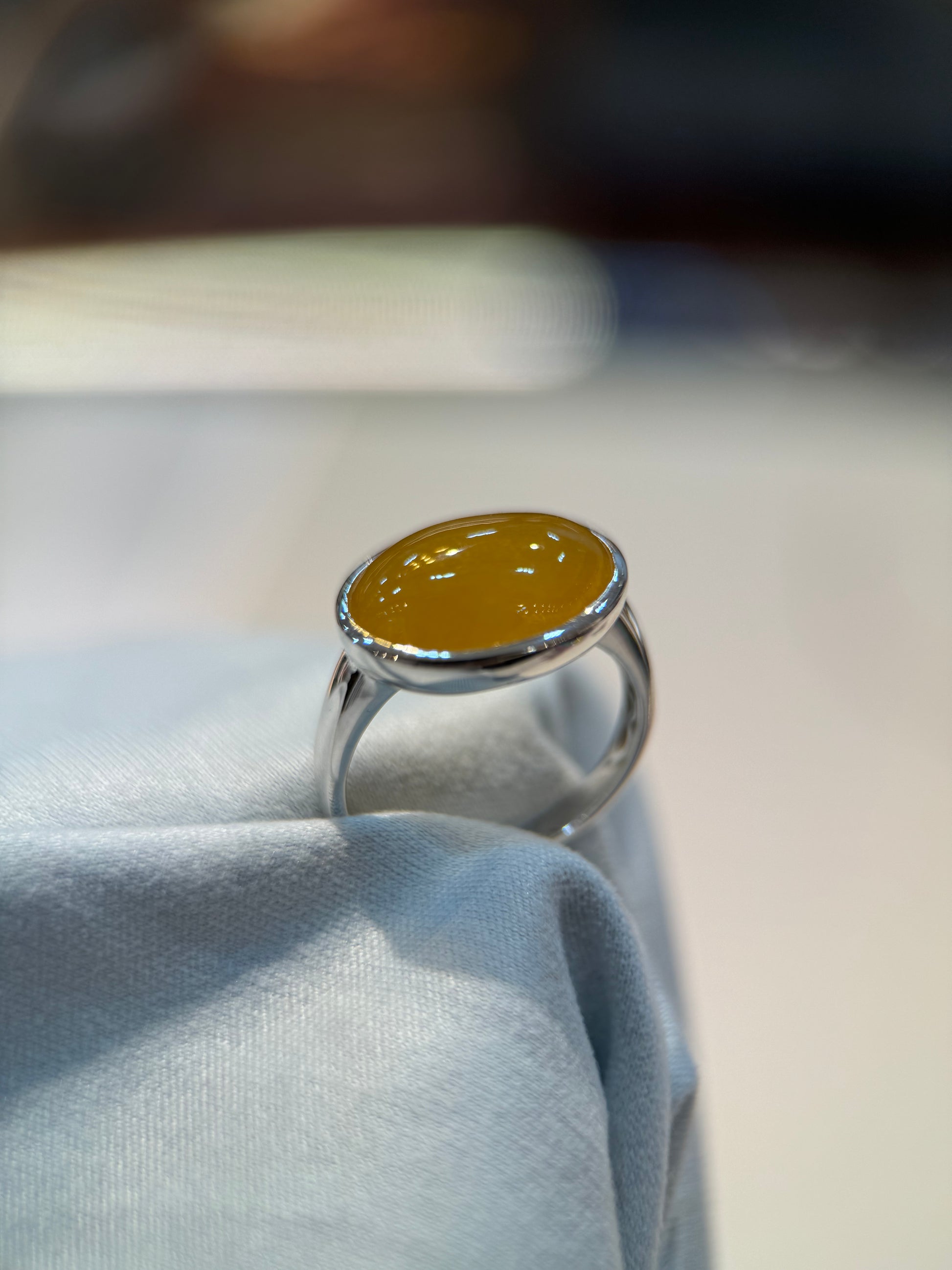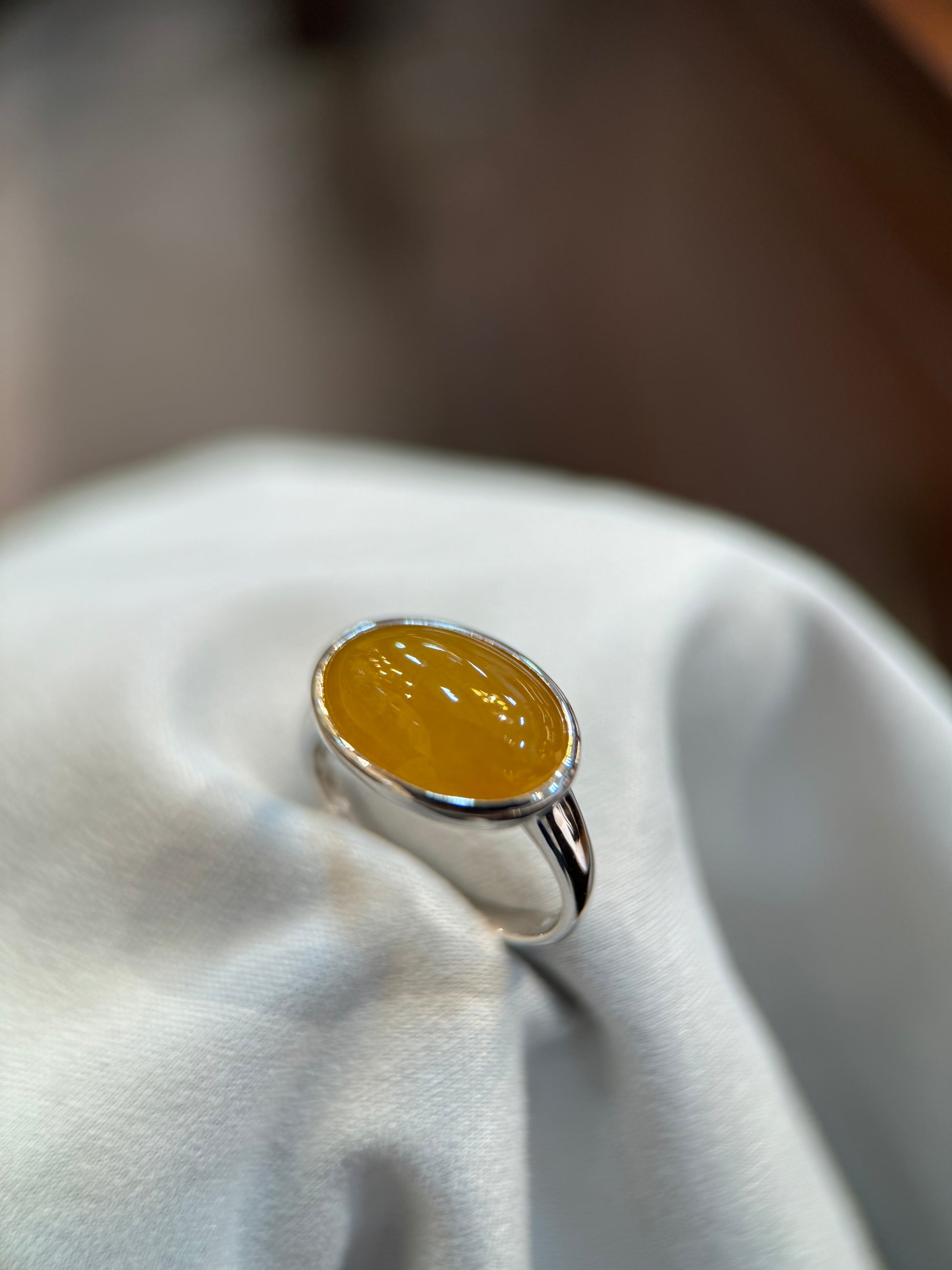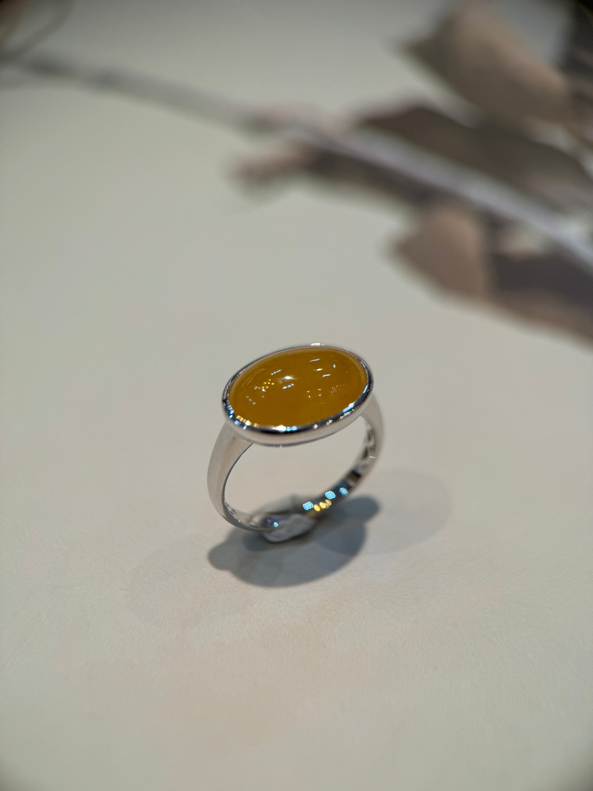 Discover elegance and natural beauty with our Honey Cabochon Jade Ring. This exquisite piece showcases a stunning jade stone with intense honey tones, characterized by high density and fine stone aggregate that enhances its vivid color. The translucency of the jade further illuminates its captivating hues.