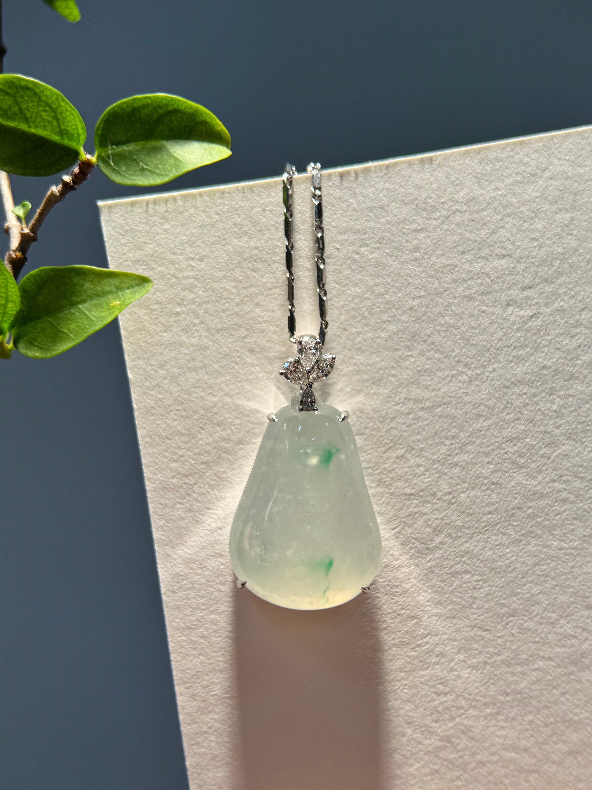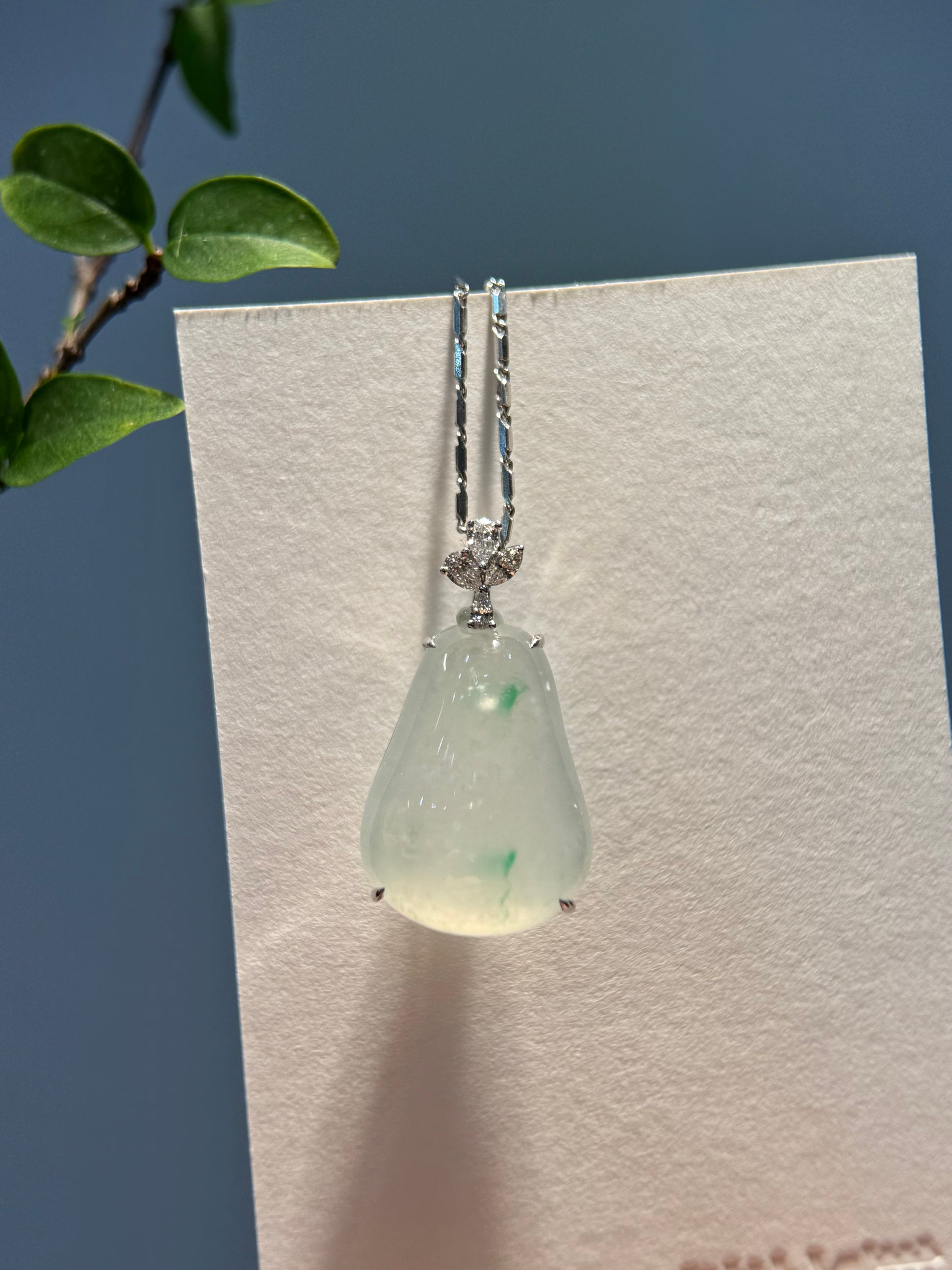 A dainty piece of jadeite melon pendant carved in icy jadeite which is highly translucent in quality . The jade has good lustre and fine grain. Glossy finished in texture, the melon had a small patches of light green hue falls on the surface of the jade. Set simply in 18K white gold, mixed of marquise and pear shape sparkling natural diamonds , the design is purposely set simple and classic so that it will be suitable to go along with work attire and casual wearing. It is also a great choice as a gift.