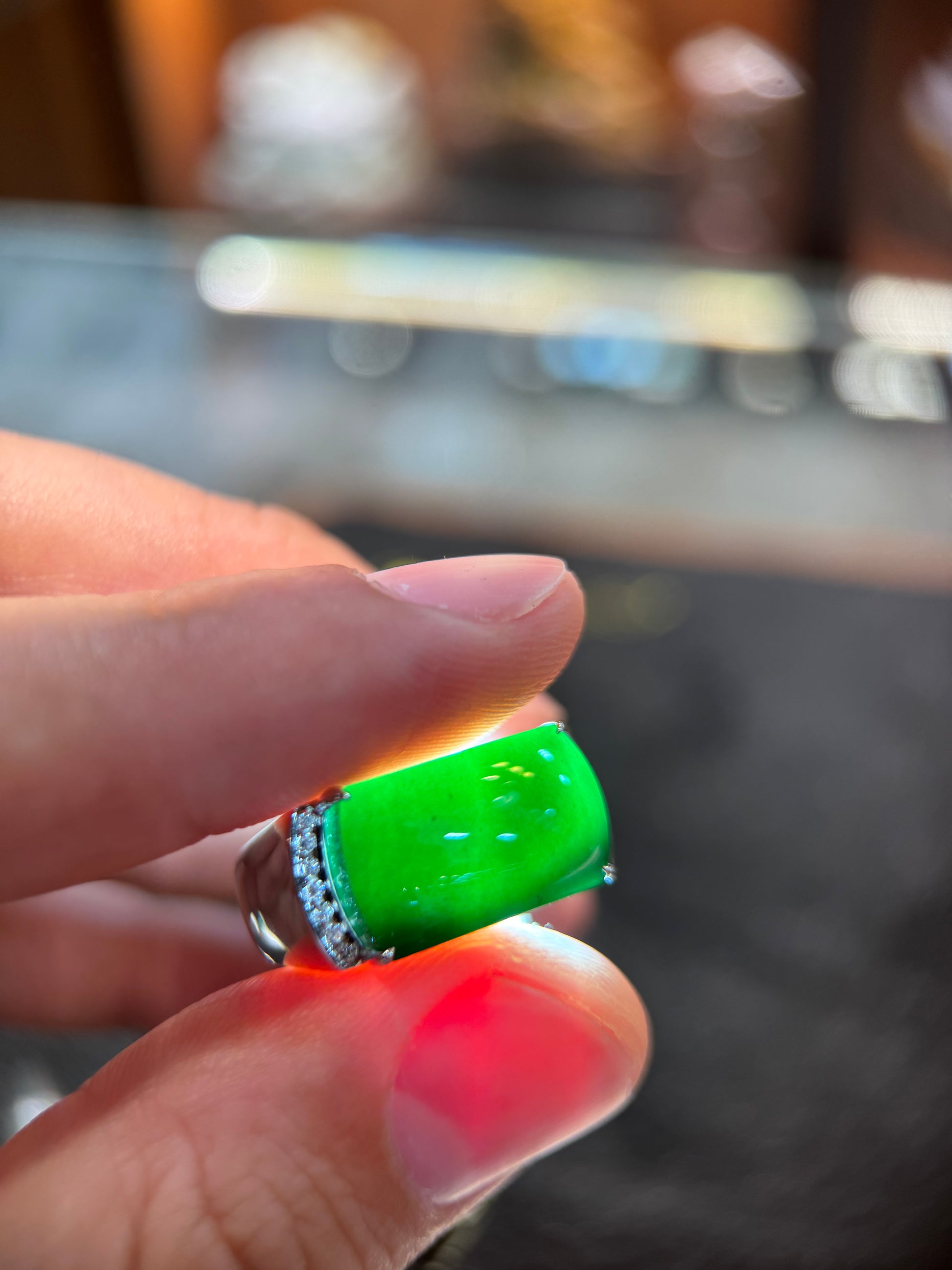 Omphacite of high quality in material that is carved into a saddle shape . The surface of the jade is exceptionally clean, well polished and glossy black without any inclusion . The jade gives off vivid green hue evenly spread out where not any significant inclusion you can clearly spot under the light. Set simply in 18k white gold with a line of diamond on each side of the ring, the jade is designed classically to retain the beauty of the jade.